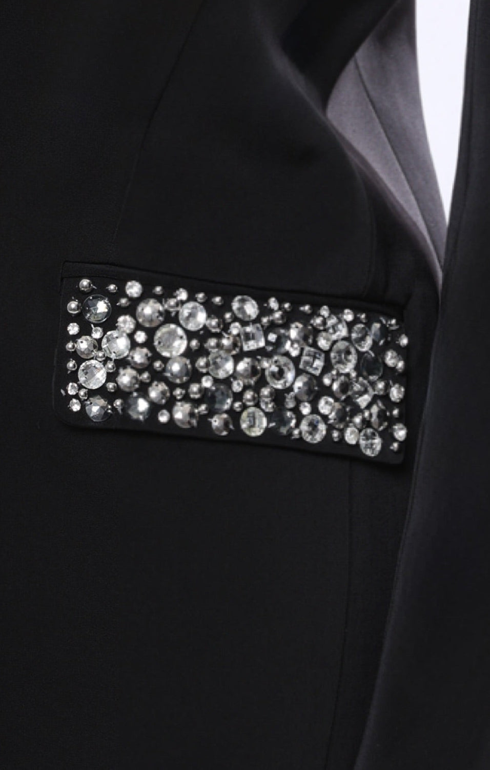 Tailored to captivate, this black statement blazer blends sharp structure with undeniable glamour. Crystal embellishments frame the lapel and accent the pockets, catching the light with every movement and adding a striking contrast against the sleek black silhouette.